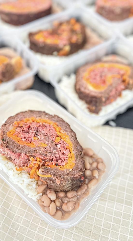 Arroz branco, feijão carioca, rocambole de carne cenoura, calabresa e queijo (com lactose)